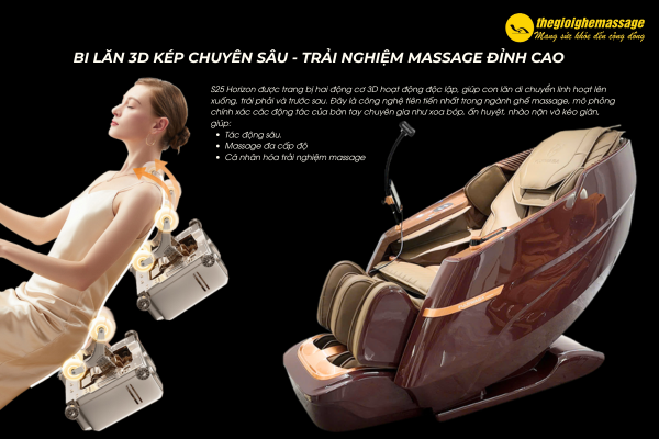 S25 Horizon được trang bị hai động cơ 3D hoạt động độc lập, giúp con lăn di chuyển linh hoạt lên xuống, trái phải và trước sau. Đây là công nghệ tiên tiến nhất trong ngành ghế massage, mô phỏng chính xác các động tác của bàn tay chuyên gia như xoa bóp, ấn huyệt, nhào nặn và kéo giãn.