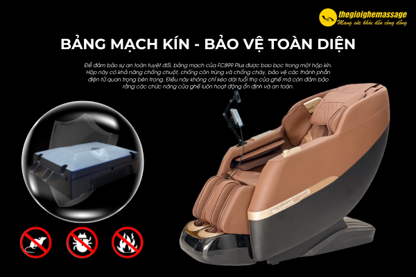 Chống lại các mối đe dọa từ chuột và ẩm mốc, bảng mạch của chiếc ghế massage này được bọc trong 1 hộp kín, đặt ra một tiêu chuẩn mới về độ tin cậy và an toàn cho người sử dụng. Bảo vệ không chỉ các bộ phận điện tử mà còn đảm bảo sự an tâm tối đa khi sử dụng sản phẩm trong mọi môi trường.