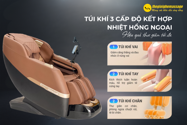 | ĐẶC ĐIỂM NỔI BẬT | -Phương pháp massage: nhào, shiatsu, tuina, rap, vỗ…-Túi khí bọc: bao gồm vai, cánh tay, bắp chân và bàn chân.