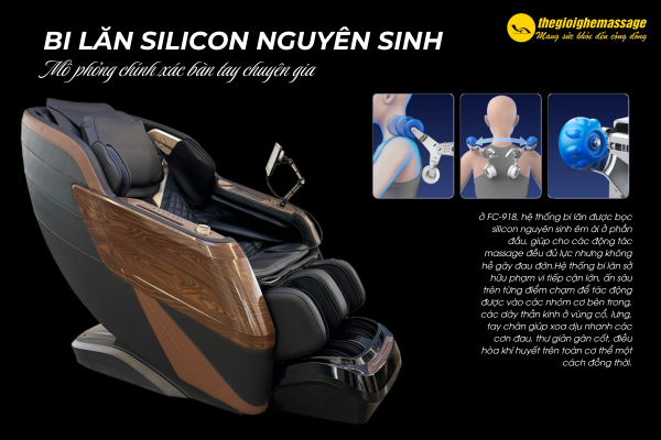 Trên ghế massage FC-918 SIGNATURE, bi lăn 4D được bọc silicon nguyên sinh êm ái ở phần đầu, giúp cho các động tác massage đều đủ lực nhưng không hề gây đau đớn. Ngoài ra, hệ thống bi lăn sở hữu phạm vi tiếp cận lớn, ấn sâu trên từng điểm chạm để tác động được vào các nhóm cơ bên trong, các dây thần kinh ở vùng cổ, lưng, tay chân giúp xoa dịu nhanh các cơn đau, thư giãn gân cốt, điều hòa khí huyết trên toàn cơ thể một cách đồng thời.
