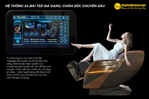 Hệ thống bài tập cá nhân hóa của ghế massage FC-918 SIGNATURE chắc chắn sẽ khiến khách hàng hài lòng với khả năng chăm sóc chuyên sâu cho từng đối tượng. cụ thể. Số lượng bài tập cá nhân hóa đa dạng đủ cho cả gia đình, đáp ứng được nhu cầu của nhiều đối tượng khác nhau. Mỗi bài tập được Fujicare nghiên cứu chuyên sâu giải quyết các vấn đề đau mỏi vai gáy, chân, bắp đùi, chăm sóc cột sống kỹ càng… Giúp người dùng dễ dàng nhận thấy cơ thể có sự cải thiện tích cực sau một thời gian sử dụng.
