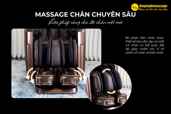 Bên cạnh đó, phần chân ghế được tích hợp hệ thống túi khí massage kết hợp với con lăn bấm huyệt, tác động sâu đến các huyệt đạo quan trọng ở lòng bàn chân. Nhờ vậy, tuần hoàn máu được kích thích, căng thẳng tan biến, mang lại cảm giác thư giãn và cải thiện sức khỏe toàn diện.