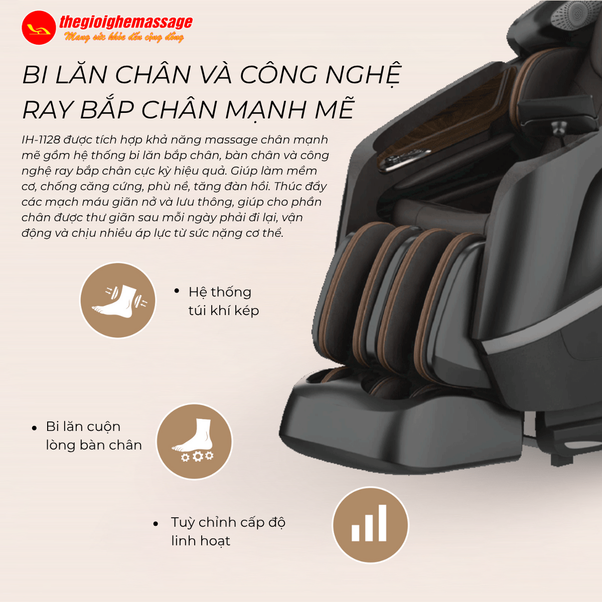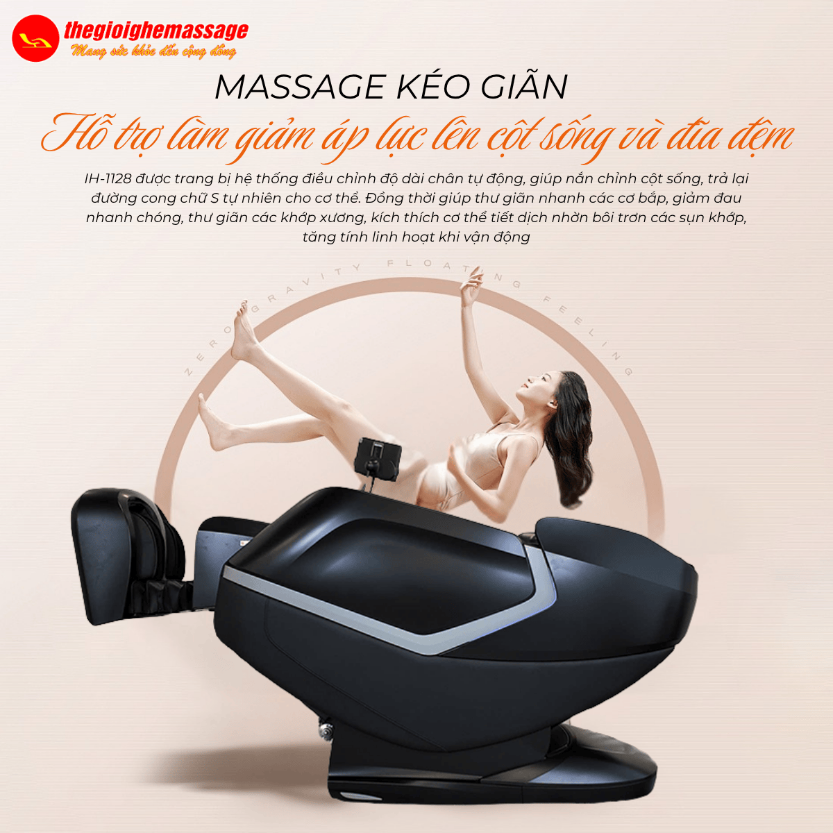 IH1128 được trang bị hệ thống điều chỉnh độ dài chân tự động, giúp nắn chỉnh cột sống, trả lại đường cong chữ S tự nhiên cho cơ thể. Đồng thời giúp thư giãn nhanh các cơ bắp, giảm đau nhanh chóng, thư giãn các khớp xương, kích thích cơ thể tiết dịch nhờn bôi trơn các sụn khớp, tăng tính linh hoạt khi vận động