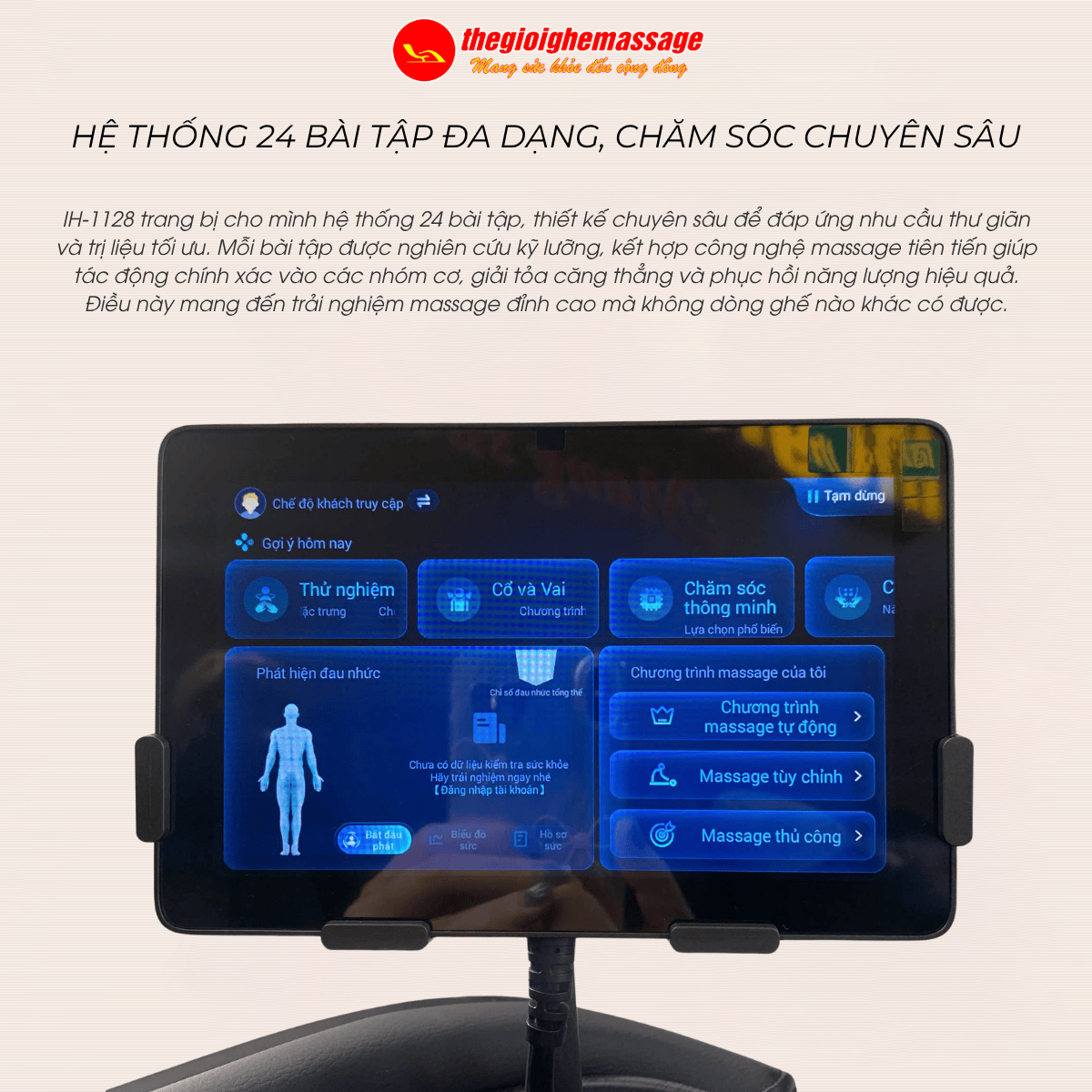 IH1128 trang bị cho mình hệ thống 24 bài tập, thiết kế chuyên sâu để đáp ứng nhu cầu thư giãn và trị liệu tối ưu. Mỗi bài tập được nghiên cứu kỹ lưỡng, kết hợp công nghệ massage tiên tiến giúp tác động chính xác vào các nhóm cơ, giải tỏa căng thẳng và phục hồi năng lượng hiệu quả. Điều này mang đến trải nghiệm massage đỉnh cao mà không dòng ghế nào khác có được.
