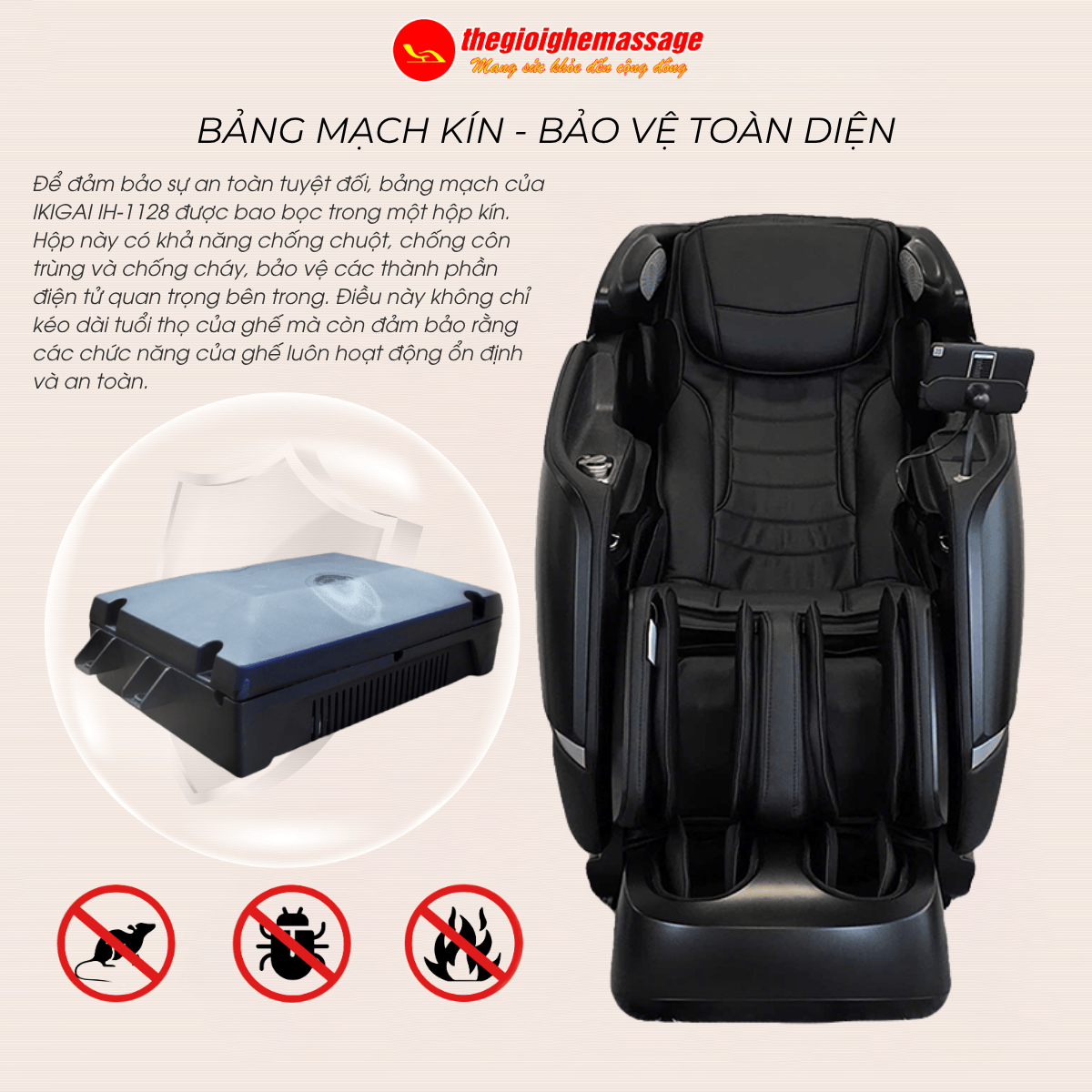 Để đảm bảo sự an toàn tuyệt đối, bảng mạch của IKIGAI - IH1128 được bao bọc trong một hộp kín. Hộp này có khả năng chống chuột, chống côn trùng và chống cháy, bảo vệ các thành phần điện tử quan trọng bên trong. Điều này không chỉ kéo dài tuổi thọ của ghế mà còn đảm bảo rằng các chức năng của ghế luôn hoạt động ổn định và an toàn.