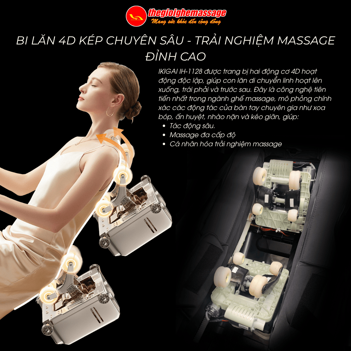 IH1128 được trang bị hai động cơ 4D hoạt động độc lập, giúp con lăn di chuyển linh hoạt lên xuống, trái phải và trước sau, mô phỏng chính xác các động tác của bàn tay chuyên gia như xoa bóp, ấn huyệt, nhào nặn và kéo giãn.
