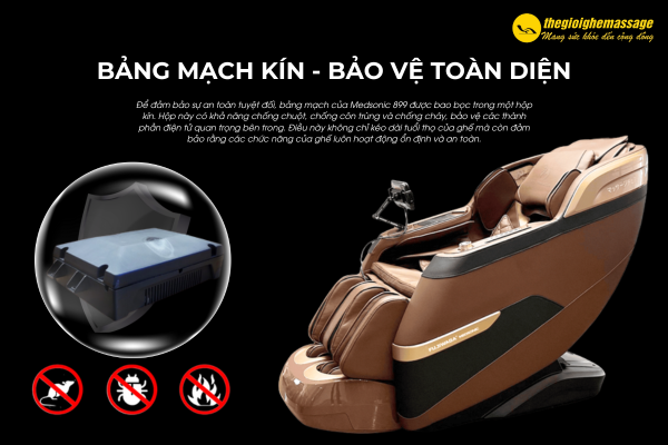 Bảng mạch của Medsonic 911 Plus được bảo vệ trong hộp kín, chống chuột, côn trùng và cháy, đảm bảo an toàn tuyệt đối cho người dùng. Điều này không chỉ kéo dài tuổi thọ của ghế mà còn giúp các chức năng hoạt động ổn định. Bạn có thể yên tâm sử dụng ghế massage mà không lo về các tác nhân gây hại từ bên ngoài.