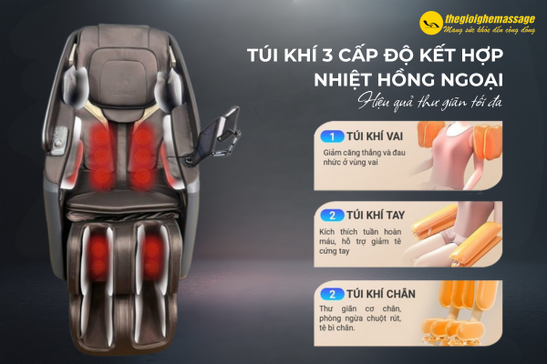 Hệ thống túi khí đa điểm được bố trí dọc cơ thể: vai, tay, bắp chân, bàn chân. Túi khí co giãn nhịp nhàng, mô phỏng các động tác xoa bóp, nén và thả của những kỹ thuật viên chuyên nghiệp.