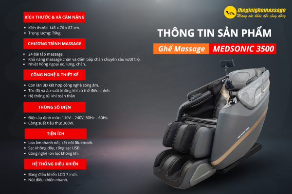 Medsonic 3500 không chỉ đơn thuần là một chiếc ghế massage, mà là “trung tâm chăm sóc sức khỏe mini” tại gia, từ thư giãn nhẹ nhàng đến trị liệu chuyên biệt đáp ứng nhu cầu thư giãn, hỗ trợ trị liệu tại nhà.