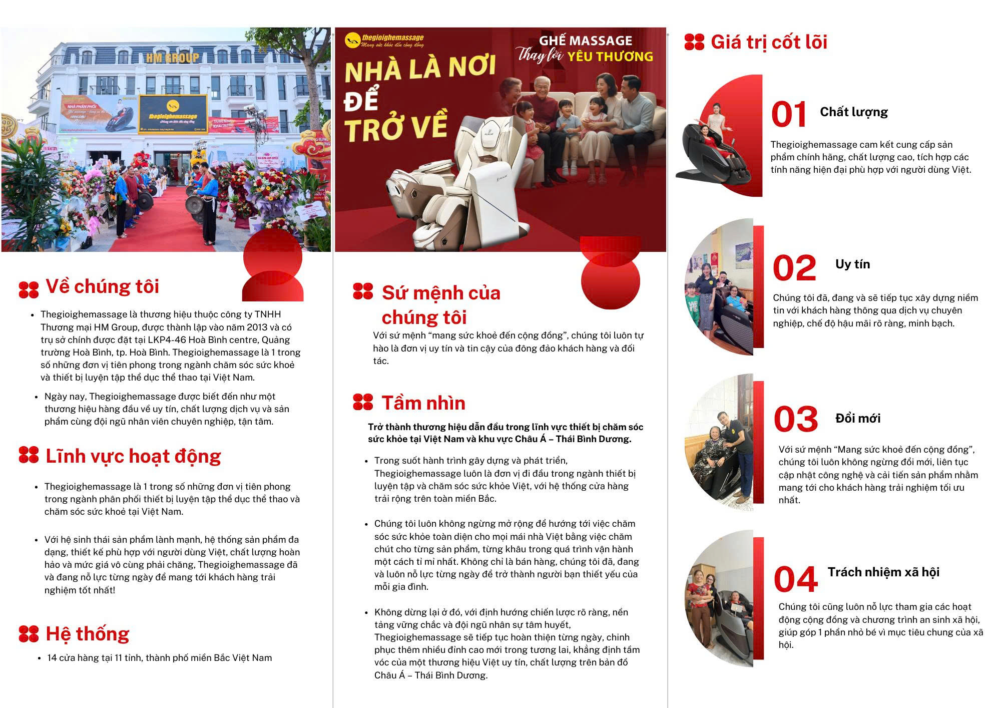 Thành lập năm 2013, HM Group - hay còn được biết đến rộng rãi với cái tên Thegioighemassage - khởi đầu với khát vọng trở thành doanh nghiệp tiên phong trong lĩnh vực chăm sóc sức khỏe tại Việt Nam. Trải qua 12 năm phát triển không ngừng, từ một công ty trẻ với tầm nhìn táo bạo, HM Group đã từng bước vươn mình trở thành một trong những thương hiệu dẫn đầu trong lĩnh vực phân phối ghế massage, thiết bị thể thao và chăm sóc sức khỏe toàn diện. Dấu ấn người dẫn lối – CEO Lê Văn Mạnh Đứng sau sự phát triển bền vững của HM Group là ông Lê Văn Mạnh, nhà sáng lập kiêm Tổng Giám đốc công ty. Với tinh thần tiên phong, tư duy đổi mới và tâm huyết với sứ mệnh chăm sóc sức khỏe cộng đồng, ông đã dẫn dắt HM Group vượt qua nhiều thử thách, mở rộng quy mô, nâng tầm sản phẩm và dịch vụ. “Chúng tôi không đơn thuần kinh doanh sản phẩm, mà mang đến giải pháp toàn diện giúp người Việt sống khỏe hơn, hạnh phúc hơn mỗi ngày.” – Ông Lê Văn Mạnh, CEO HM Group. Hành trình phát triển ấn tượng 2013 – Thành lập HM Group. 2015 – 2020 – Mở rộng hệ thống showroom trên toàn miền Băc. 2022 – Hợp tác chiến lược với các thương hiệu đi đầu trong nước và quốc tế. 2024 – Ra mắt thương hiệu ghế massage IKIGAI. 2025 – Tiếp tục mở rộng hệ sinh thái, chuyển đổi số toàn diện. IKIGAI – Bản sắc mới của sự tinh tế và công nghệ Ra mắt vào năm 2024, IKIGAI là thương hiệu ghế massage cao cấp do chính HM Group phát triển. Lấy cảm hứng từ triết lý sống "Ikigai" của người Nhật – sống có mục đích, có giá trị – dòng sản phẩm IKIGAI hội tụ sự tinh tế trong thiết kế, tối ưu trong công năng và đột phá trong công nghệ chăm sóc sức khỏe. Sứ mệnh & Tầm nhìn: Mang sức khỏe đến cộng đồng Với phương châm “Nơi sức khỏe khởi nguồn cho hạnh phúc”, HM Group không ngừng đổi mới, lấy khách hàng làm trung tâm và cam kết mang đến những sản phẩm, dịch vụ chất lượng cao nhất. Chính trực trong kinh doanh Tiên phong trong công nghệ Tận tâm với khách hàng Phát triển bền vững vì cộng đồng Nhìn lại chặng đường 12 năm, HM Group tự hào vì đã góp phần thay đổi nhận thức về chăm sóc sức khỏe chủ động trong cộng đồng. Sự tin tưởng của khách hàng và đối tác chính là động lực để chúng tôi không ngừng phát triển, giữ vững vị thế tiên phong và chinh phục những cột mốc mới. HM Group – 12 năm một hành trình, cả đời một sứ mệnh - Mang sức khoẻ đến cộng đồng!