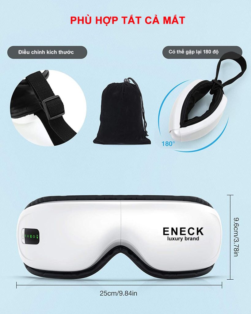 Khi phải làm việc trong thời gian dài, mắt chúng ta trở nên khô, căng, xoang sẽ bị áp lực và gây đau đầu. Lúc này những gì bạn cần là một máy mát xa tốt để chăm sóc cho mắt và các vùng xung quanh mắt. Áp suất không khí thông minh tác động lên mắt sẽ giúp xoa dịu mắt và xoang, giảm ngay các cơn đau đầu. Bên cạnh đó máy còn có tính năng xông ấm mắt bằng không khí nén nóng giúp cải thiện lưu thông máu, thư giãn tâm trí và giúp bạn ngủ ngon hơn. 5 Chế Độ Massage Giúp Xoa Dịu Đôi Mắt Mệt Mỏi là các sự kết hợp tính năng khác nhau tùy theo mục đích của bạn sử dụng. Mang lại cho đôi mắt và tinh thần một sức sống mới. Dễ Dàng Sử Dụng Chỉ với 1 Nút Điều Khiển: Máy được trang bị một màn hình LCD và chỉ với một nút bấm để chuyển qua lại các chế độ khác nhau. Chế độ mặc định sẽ thiết lập massage trong 15 phút để tiết kiệm điện năng và bảo vệ mắt bạn. Mỗi ngày chỉ cần sử dụng một lần. Kết Hợp Bluetooth Để Nghe Nhạc Tiện Lợi: kết nối bluetooth với điện thoại hay các thiết bị chuyên dụng giúp bạn nghe được mọi bài hát yêu thích hoặc sách nói trong lúc đang thư giãn. Điều chỉnh âm lượng thông qua điện thoại dễ dàng. Hoàn Toàn Không Dây và Sạc Thông Qua USB Tiện Lợi: Để tạo sự tiện lợi và thư giãn tối đa, máy massage mắt hoàn toàn không dây khi sử dụng. Khi máy gần cạn năng lượng mới cần sạc thông qua một cổng USB gọn gàng. Máy Có Thể Được Gấp Gọn 180° bỏ vừa vào một túi nhung nhỏ kèm theo, dễ dàng mang tới bất cứ đâu bạn muốn. Chất Liệu Máy Thân Thiện Với Môi Trường Sống và Dễ Dàng Vệ Sinh: Lớp ngoài máy được làm từ nhựa ABS loại nhựa chuyên được dùng sản xuất điện gia dụng vì độ bền và không độc hại. Lớp lót bên trong được làm từ PU kháng khuẩn, dễ dàng được lau sạch bằng khăn mềm và cồn y tế. Dây Đeo Co Giãn Phù Hợp Với Nhiều Kích Thước Đầu: đảm bảo thoải mái cho phần lớn người dùng.